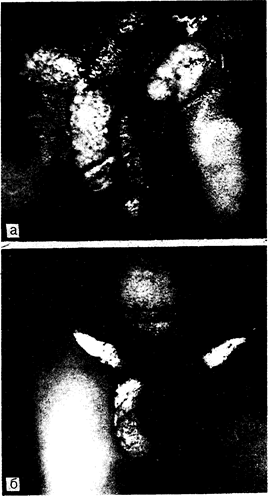 Рис. 111-1. Обширная паховая гранулема, распространяющаяся вдоль мошонки и вовлекающая пахово-мошоночные складки с приподнятой, очищенной, разросшейся грануляционной тканью. я — до лечения; б — после лечения (с любезного согласия A. Brathwaite).