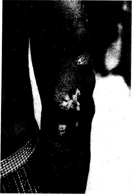 Рис. 123-1. Ранние очаги фрамбезии с подкожными околосуставными узлами (левая рука).