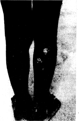 Рис. 123-2. Вторичные язвенно-папилломатозные очаги при фрамбезии (правая нога).