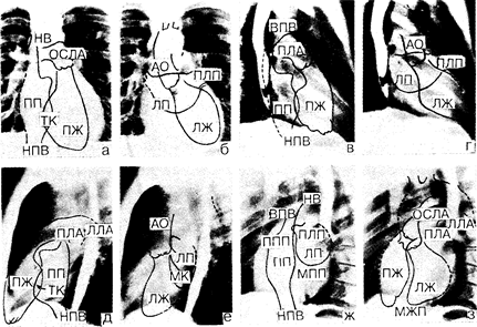 Тень сердца. Труднее всего поддается исследованию правое предсердие. Расширение его, однако, может вызывать появление выпячивания вправо и усиление кривизны правой границы сердца в заднепередней и в левой передней косой проекциях. Правый желудочек лучше всего виден в боковой проекции, при этом его передняя стенка располагается сразу позади нижней трети грудины. По мере расширения правый желудочек оттесняет ткань легких, заполняя и верхнюю часть ретростернального пространства. Дальнейшая дилатация правого желудочка приводит к пассивному смещению остальных камер сердца, в частности левого желудочка.