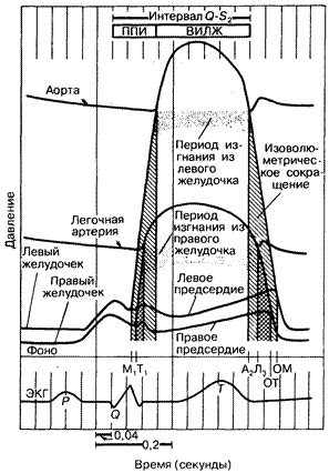 Рис. 179-2. Схематическое сопоставление кривых внутрисердечного и аортального давления с электрокардиограммой (ЭКГ) и фонокардиограммой (Фоно). Заштрихованные области, обозначенные «ИзоВ», соответствуют изоволюметрическим фазам сокращения и расслабления левого и правого желудочков соответственно; mi, TI, АII и ЛII—тоны сердца, возникающие при закрытии левого предсердно-желудочкового (митрального), правого предсердно-желудочкового (трехстворчатого) клапанов, клапанов аорты и легочного ствола соответственно. ОТ и ОМ — звуки, возникающие при открытии правого и левого предсердно-желудочкового клапана. Интервал Q — S2 включает в себя период предызгнания (ППИ) и время изгнания из левого желудочка (ВИЛЖ). Все эти показатели могут быть измерены неинвазивным путем (см. текст).