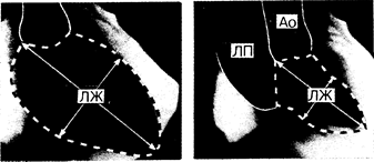 Слева — конец диастолы, справа — конец систолы. Исследование выполнено в правой передней косой проекции у больного с тяжелой митральной регургитацией, у которого левое предсердие (ЛП) хорошо контрастируется одновременно с аортой (Ао) во время систолы желудочков. Объем (О) и размер ЛЖ определяют планиметрически, измеряя площадь камеры (ограничена пунктирной линией), длину большей оси (сплошная линия, соединяющая основание и верхушку) и используя геометрическую модель эллипсоида. Таким образом, Д = 4П/Л и O=(Д2Л/6), где Д—расчетный диаметр; Л—длина большей оси; П — площадь; О — объем ЛЖ. Средняя скорость кругового укорочения волокон также может быть рассчитана с помощью непосредственного измерения малой оси (показана стрелками), расположенной перпендикулярно к большей оси в ее середине. Зная скорость получения изображений и количество их, полученное от начала до завершения фазы изгнания, можно определить время изгнания.
