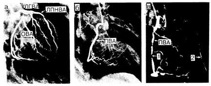 Рис. 180-4. Селективные коронарные артериограммы, полученные из правой передней косой проекции. а, б — артериограммы, полученные у здорового человека; в—у больного с тяжелым стенозом правой венечной артерии. Стрелка 1 указывает на участок сужения правой венечной артерии, а стрелка 2 — на ретроградное заполнение передней нисходящей венечной артерии через коллатеральные сосуды, что свидетельствует о тяжелой обструкции и этого сосуда. Обозначения: ЛГВА—левая главная венечная артерия; ОВА — огибающая венечная артерия; ЛПНВА — левая передняя нисходящая венечная артерия; ПВА — правая венечная артерия (Courtesy of M. P. Judkins).