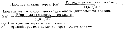 Размеры просвета клапана и клапанная регургитация. При нормальном сердечном выбросе выраженность стенотического поражения клапана может быть определена путем измерения градиента давления через клапан. Если же сердечный выброс повышен или снижен, то заключения о степени механической обструкции, сделанные на основании лишь градиента давления, могут быть ошибочными. Кроме того, оценивая выраженность градиента давления, важно учитывать также частоту сердечных сокращений. В случае частых сердечных сокращений систола занимает непропорционально большую часть каждого сердечного цикла. При этом время заполнения камер сердца кровью в диастолу ограничено. Вследствие этого даже относительно небольшой стеноз сопровождается высоким градиентом давления через атриовентрикулярный клапан. В этих ситуациях большую помощь в анализе выраженности клапанного стеноза оказывают гидравлические формулы, разработанные Горлин и Горлин для расчета величины просвета клапана. В соответствии с этими формулами: