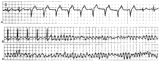 Рис.184-9. Ускоренный идиовентрикулярный ритм и фибрилляция желудочков. а — ускоренный идиовентрикулярный ритм. Видно, как во II отведении появился и оборвался ритм, характеризующийся широкими комплексами, частота которых лишь немного больше, чем при синусовом ритме; бив — фибрилляция желудочков. У больного с коронарной болезнью сердца фибрилляция желудочков была спровоцирована ПЖК, вслед за которой развилась быстрая полиморфная желудочковая тахикардия, перешедшая вскоре в фибрилляцию желудочков (обратите внимание на колеблющуюся изолинию, что не позволяет различить систолу и диастолу).