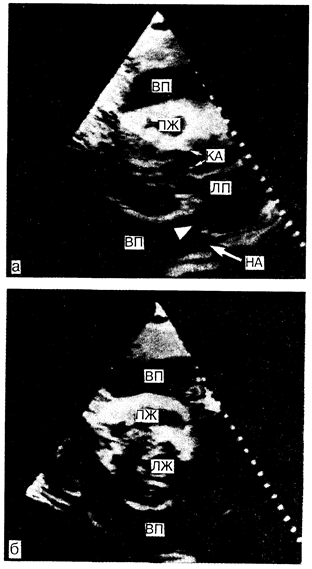 Стрелками указано распространение жидкости за левое предсердие и вперед в область нисходящей грудной аорты, а — двухмерное изображение; б — изображение в коротком размере. Обозначения: НА— нисходящая аорта; КА — клапан аорты; ЛП — левое предсердие; ЛЖ — левый желудочек; ВП — выпот в перикарде; ПЖ — правый желудочек (с изменениями из PC Come (Ed). Diagnostic Cardiology: Noninvasive imaging techniques. — Philadelphia, Lippincott 1985)