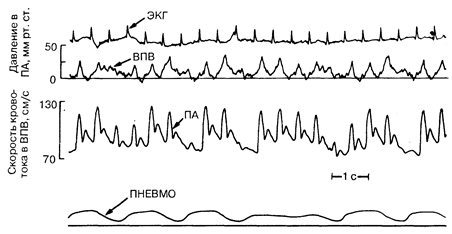Отклонение книзу пневмограммы соответствует вдоху, в это время скорость кровотока в ВПВ повышается и артериальное давление понижается (парадоксальный пульс). Артериальное давление поддерживается во время продолжительной дыхательной паузы.