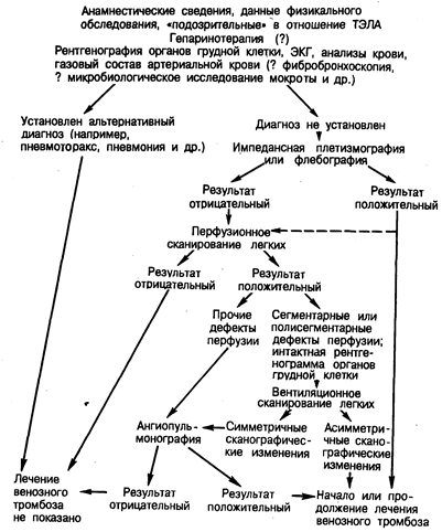 Сложности в диагностике ТЭЛА обусловлены прежде всего наличием или отсутствием доказательств глубокого венозного тромбоза, выраженностью симптомов, а также опасностью пассивной (выжидательной) тактики ведения больного. Если в ходе импедансной плетизмографии или флебографии удается подтвердить факт глубокого венозного тромбоза, то это обстоятельство уже само по себе является веским основанием для начала антикоагулянтной терапии; проведение же при этом в последующем перфузионного сканирования легких оказывается необходимым лишь в редких случаях. Таким образом, диагностический поиск венозного тромбоза — составная часть комплексного обследования при ТЭЛА. Так, более чем у 20% больных, перенесших легочную тромбоэмболию, не удается обнаружить признаков флеботромбоза, возможно, потому, что тромботические массы могут полностью мобилизоваться. В этой связи при наличии выраженных клинических проявлений и/или возможного развития осложнений от проводимого медикаментозного лечения больным, безусловно, показано проведение ангиопульмонографии.