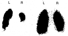 Рис. 211-2. Перфузионная сканограмма легких, задняя проекция (слева) —визуализируются множественные сегментарные и полисегментарные дефекты перфузии в верхней и нижней долях правого легкого, а также в язычковых сегментах и нижней доле левого легкого. Вентиляционная сканограмма того же больного демонстрирует нормальное и равномерное распределение 133Хе. Диагноз множественной тромбоэмболии ветвей легочной артерии подтвержден в ходе ангиопульмонографического исследования.