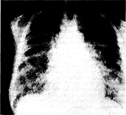 Рис. 216-1. Рентгенограмма органов грудной клетки (прямая проекция) больного с респираторным дистресс-синдромом взрослых, развившимся на почве вирусной пневмонии тяжелого течения.