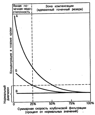 На рис. 218-1 изображены различные варианты реакции на такие нарушения процесса фильтрации. Степень снижения общей СКФ откладывают на оси абсцисс и выражают в процентах от ее значения в норме (100%). Для различных растворенных веществ, в норме содержащихся в клубочковом фильтрате, характерны три основных типа реакции, представленные кривыми А, Б и В. Кривая А описывает тип реакции, наблюдаемый для таких веществ, как креатинин и мочевина, экскреция которых в мочу в норме зависит в основном от клубочковой фильтрации, т. е. секреция не оказывает значительного влияния на уровень их экскреции с мочой. Поэтому по мере снижения СКФ уровень содержания в плазме крови креатинина, мочевины и других веществ, которые в норме экскретируются главным образом посредством фильтрации, постепенно увеличивается, хотя и нелинейным образом.
