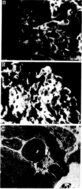 Хотя в приведенном выше схематическом изображении процесса заранее предполагается, что иммунные комплексы образуются в системе кровообращения, а затем откладываются в сосудистых структурах, можно также предположить, что они образуются также и во внесосудистом (интерстициальном) пространстве в результате диффузии клеточных антигенов и циркулирующих в крови антител. Этим феноменом можно объяснить отложение иммунных комплексов в интерстиции почек при относительной сохранности клубочкового кровообращения. Независимо от характера происхождения того или иного антигена или антитела или от конкретных условий, в которых происходят соответствующие иммунные процессы, ценную информацию, подтверждающую наличие отложений иммунных комплексов, дает морфологическая картина, обнаруживаемая при исследовании тканей при помощи иммунофлюоресценции или электронной микроскопии. Зернистые, прерывистые или неравномерные отложения IgG, часто в сочетании с компонентами системы комплемента, выявляются при иммунофлюоресцентном исследовании (рис. 222-1,б), в то время как электронно-плотные отложения наблюдаются при электронной микроскопии (рис. 222-1, в). Иногда эти отложения приобретают определенную субструктуру, но в большинстве случаев имеют гомогенный характер. Эти отложения могут локализоваться в нескольких участках внутри клубочка: под эпителиальными клетками (субэпителиально), внутри базальной мембраны (внутримембранно), под эндотелием (субэндотелиально) и в матриксе мезангия. Иногда иммунные комплексы локализуются в сети пери-канальцевых капилляров. Точная причина подобной локализации отложений еще недостаточно ясна, но нельзя исключить роль таких факторов, как размер или заряд конкретных комплексов, наличие внутри клубочковых структур рецепторов для Fc или компонентов комплемента или локальные изменения гемодинамики. Размер этих отложений, по-видимому, увеличивается за счет агрегации, и существуют некоторые данные о том, что клетки клубочков могут участвовать в их удалении. Стойкое присутствие отложений зависит от баланса скорости их образования и уравновешивающей ее активности систем их удаления. Сам IgG, содержащийся в циркулирующем в крови иммунном комплексе, отложившемся затем в клубочковых сосудах, может вести себя как внедренный антиген, или посредством идиотипических детерминант, имеющихся в местах связывания антигена на поверхности антитела, или через Fc-отделы, вызывающие антииммуноглобулиновую реакцию (ревматоидный фактор). Роли, которые соответственно играют антиидиотипическое антитело или ревматоидный фактор в эволюции повреждений клубочков при заболевании, вызванном иммунными комплексами, еще до конца не выяснены. После того как циркулирующие в крови иммунные комплексы отложились в клубочках, они вызывают местное воспаление и функциональные изменения, которые, по меньшей мере в отношении клубочкового кровообращения, относительно независимы от действия комплемента или полиморфно-ядерных лейкоцитов. Инфильтрирующие лейкоциты могут играть основную роль в опосредованном повреждении клубочков. Степень морфологических повреждений, возникающих в результате отложения иммунных комплексов, может сильно варьировать — от диффузных пролиферативных до непролиферативных мембранозных или склерозирующи