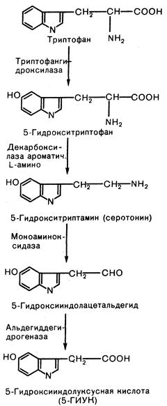 Вторичный эффект избыточной продукции серотонина проявляется и в тех случаях, когда значительная часть поступающего с пищей триптофана метаболизируется в процессе гидроксилирования; при этом меньшее его количество становится доступным для образования никотиновой кислоты и белков. При экскреции с мочой 5-ГИУК, превышающей 200—300 мг/сут, снижается уровень триптофана в плазме и выявляется дефицит никотинамида (см. гл. 76).
