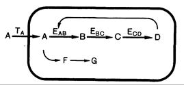 Значение генетического дефекта для метаболизма клетки и состояния организма зависит от роли мутантного белка в обмене веществ и тяжести дефекта. Как уже упоминалось, большинство врожденных «ошибок» — результат дефекта внутриклеточных ферментов или процессов мембранного транспорта. Поскольку подобного рода мутации неоднократно обсуждаются далее, целесообразно очертить возможные последствия нарушения транспортных или ферментативных процессов в обобщенном виде. Примером может служить схематическая последовательность реакций, представленная на рис. 305-1. Литерами А, В, С, D, F и G обозначены субстраты или продукты ряда ферментативных реакций, а та, ЕАВ, ЕВС