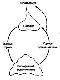Рис. 320-1. Гипофизарная регуляция таких эндокринных органов, как надпочечники, щитовидная железа или гонады, по механизму обратной связи.