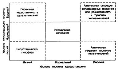 В-пятых, концентрация большинства гормонов в плазме среди здорового населения колеблется в широких пределах. Следовательно, у какого-либо человека уровень гормона может снижаться или возрастать даже вдвое (и это будет резким нарушением для данного человека), но все еще оставаться в так называемых нормальных пределах. Поэтому часто возникает необходимость одновременного определения уровня соответствующих гормональных пар (ЛГ и тестостерон, тироксин и ТТГ). Уровень тестостерона на нижней границе нормы на фоне повышенного содержания ЛГ в плазме указывает на недостаточность семенников, тогда как тот же уровень тестостерона при нормальной концентрации ЛГ свидетельствует о нормальном эндокринном статусе (см. рис. 320-2). Подобно этому, у женщин с повышенной продукцией тестостерона и вторичным снижением уровня ТЭСГ концентрация тестостерона в плазме может быть нормальной, несмотря на нарушение его продукции.