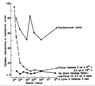 У больных с макропролактиномами бромкриптин обычно снижает уровень пролактина в сыворотке и может уменьшать массу опухоли. Концентрация тестостерона у мужчин начинает увеличиваться через 3 мес, а через 6—8 мес может достигать нормы. У некоторых больных нормализуется и число сперматозоидов.