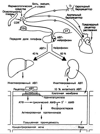 Нервная регуляция. Стимулирующее и ингибиторное влияние на гипоталамус и, следовательно, на секрецию АВП может опосредоваться нейротрансмиттерами и пептидными нейромодуляторами, такими как ангиотензин II, дофамин и эндорфины. Последним звеном, связывающим нервные пути с нейронами супраоптического ядра, осуществляющими секрецию АВП, является, по-видимому, ацетилхолин. Холинергические и -адренергические стимулы приводят к секреции АВП, тогда как атропин и -адренергическая стимуляция тормозят эту секрецию, действуя, очевидно, на уровне гипоталамуса. Эмоциональный стресс, рвота и боль могут преодолевать диурез. Последний может быть вызван гипнотическим внушением, условнорефлекторно и вдыханием углекислоты.