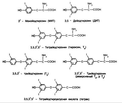 Рис. 324-1. Структурные формулы тироксина, его предшественников и некоторых метаболитов.