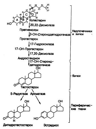 Синтез тестостерона. Биохимические реакции превращения стерина, содержащего 27 углеродных стероатомов, — холестерина — в андрогены и эстрогены показаны на рис. 330-1. Холестерин в клетке Лейдига может либо синтезироваться de novo, либо поступать в нее из липопротеидов плазмы. Холестерин превращается в тестостерон под воздействием пяти ферментов или ферментных комплексов. При этом боковая цепь холестерина отщепляется в два этапа, что приводит к уменьшению размера молекулы (с 27 углеродных атомов до 19), а кольцо А стероида приобретает 4-З-кето-конфигурацию. Упомянутыми пятью ферментами являются 20,22-десмолаза, комплекс З-гидроксистероиддегидрогеназа-4,5-изомераза, 17-гидроксилаза, 17,20-десмолазаи 17 -гидроксистероиддегидрогеназа. Первые четыре фермента содержатся и в надпочечниках.