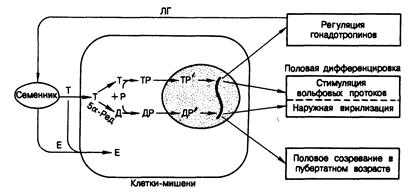 Обозначения: Т — тестостерон, Д — дигидротестостерон, Е — эстрадиол, Р — рецепторный белок, Р' — трансформированный рецепторный белок, Л Г — лютеинизирующий гормон, 5а-Ред — 5и-редуктаза.