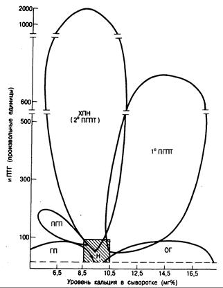 Рис. 336-2. Схематическое изображение результатов одновременного определения уровня иммунореактивного паратиреоидного гормона (иПТГ) и кальция в сыворотке у здоровых людей (Н), больных с опухолевой гиперкальциемией (ОГ), гипопаратиреозом (ГП), псевдогипопаратиреозом (ПГП), хронической почечной недостаточностью и вторичным гиперпаратиреозом (ХПН) и первичным гиперпаратиреозом (ПГПТ).