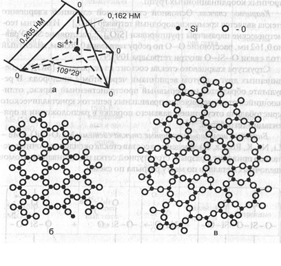 Рис. 5.1. Тетраэдр [SiO4]4-(а), схематическое изображение на плоскости структур кристаллического кварца (б) и кварцевого