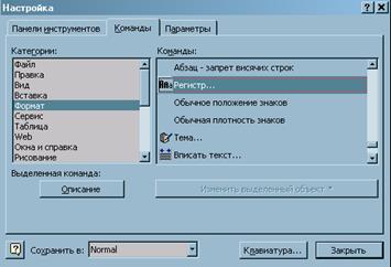 Для додавання кнопок в нову панель необхідно у вікні налаштування панелі інструментів перейти на вкладку Команди (див. рис. 3.1.1.3). Вибираєте категорію, а потім команду, яку хочете винести на панель. Методом перетягування переносите команду на нову панель. Можна змінити значок кнопки або перейменувати її. Для цього виділите необхідну кнопку і натисніть на кнопку Змінити виділений об'єкт.