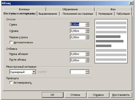 Форматування абзацу дозволяє вирівнювати, задавати відступи, встановлювати інтервали між рядками та абзацами і таке інше. Дії з абзацами виконують за допомогою команди Формат → Абзац. З’являється вікно з іменем Абзаці з вкладками: Отступы и Интервалы, де можна задавати відступи зправа, зліва, відступ для першого рядка, міжрядковий інтервал (одинарний, полуторний, двійний і так далі), відступ перед та після абзацу; Выравнивание, де можна задавати вирівнювання по лівому краю, правому, центру, ширині (відповідні кнопки виведені на панель форматування); Буквица, де можна встановити символ (декілька символів) виділеного абзацу, а також висоту буквиці, стиль написання і так далі.
