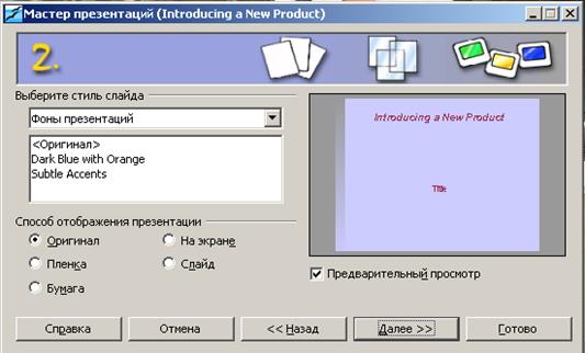 Из шаблона пропонується вибір виду презентації із пропонованого списку (службові, проекти, ділові і т.п.). На другому етапі можна обрати стиль презентації і способи її відображення: на екрані, плівці, папері, слайд і т.п.