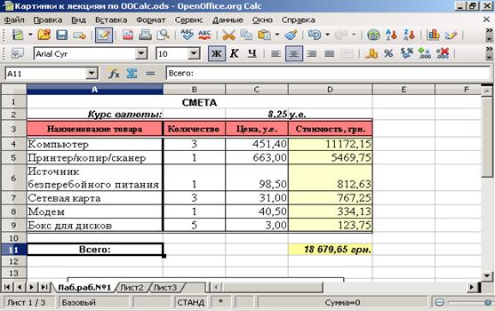 Структура ЕТ. ЕТ складається з клітинок, що утворюють рядки і стовпці (Рис.4.1, 4.2). Стовпці таблиці позначені буквами (А, В, С, ..., Z, АА, АВ, ..., AZ, ВА, ...), а рядки — цифрами (1, 2, ...). Кожна клітинка має ім’я, яке складається з літери стовпця і номера рядка, на перетині яких розташована клітинка, наприклад А1. Стовпців може бути до 256, а рядків — до 65536 (Calc - 32000).