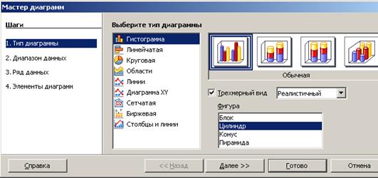 1-й крок. Вибирається тип діаграми. Окрім описаних вже основних стандартных типів діаграм можна використовувати нестандартні типи, розміщені на вкладці Нестандартные. Серед них зазначимо насамперед типи чорно-білих діаграм, назви яких починаються з "ЧБ".