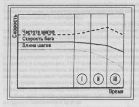 III-фаза полного утомления На рис. 12.1. показаны типичные изменения скорости передвижения, длины и частоты шагов при утомлении в циклических двигательных действиях (на примере бега на коньках). В фазе компенсированного утомления, несмотря на уменьшение длины шагов, заданная скорость сохраняется за счет увеличения их частоты. Можно полагать, что утомление первично проявляется в уменьшении силы сокращения мышц, приводящем к снижению силы