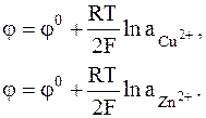 Зависимость электродного потенциала от активностей (в случае газообразных продуктов от давления) имеет такой же вид, что и ЭДС. В частности, для медного и цинкового электродов выражения для электродных потенциалов можно записать следующим образом: