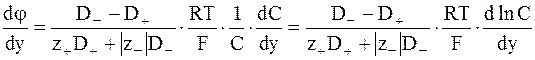 Для расчета диффузионного потенциала можно воспользоваться уравнением, получаемым интегрированием уравнения (5 ‑ 14). Действительно, из уравнения (5 - 14) следует для одномерного движения частиц (движения вдоль одного координатного направления):
