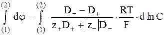 а скачок потенциала между двумя растворами, то есть на протяжении всей границы, можно получить как результат интегрирования: