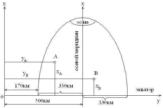 Для удобства в работе необходимо избавиться от отрицательных значений ординат в пределах каждой зоны. Расстояние от осевого меридиана зоны до ее крайнего меридиана даже в самом широком месте зоны »330 км. Но для расчетов удобнее взять расстояние, равное круглому числу километров. С этой целью, ординату осевого меридиана зоны условились считать равной 500 км. За начало координат для каждой зоны принимают точку с координатами х=0 км, у=500 км (рис.2.7). Так как одинаковые координаты точек могут повториться в каждой из 60 зон, необходимо указывать номер зоны, в которой расположен данный пункт (при указании координаты у).