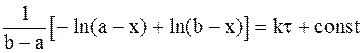 Окончательный вид уравнения, описывающего кинетику бимолекулярной необратимой реакции с разными исходными концентрациями веществ, таков: