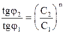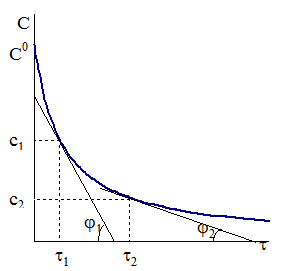 Выберем на кинетической кривой точки с концентрациями С1 и С2 и проведем касательные, как показано на рис. 9 ‑ 5. Так как угловой коэффициент каждой касательной tgj равен производной
