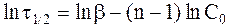 Рис. 9 - 6. Определение порядка реакции по зависимости времени полупревращения от исходящей концентрации.