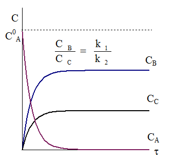 Из соотношений (10 - 1) и (10 - 2) следует, что отношение скоростей образования веществ В и С всегда постоянно и равно отношению констант скоростей k1 и k2. Следовательно, выполняется условие: отношение концентраций веществ В и С также равно отношению констант: