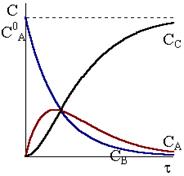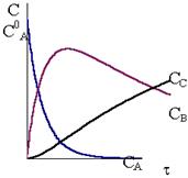 Уравнения (10 - 20), (10 - 24) и (10 - 30) позволяют описать кинетические кривые всех трех веществ А, В и С. Однако прежде, чем анализировать ход кинетических кривых, убедимся в правильности полученного результата. С этой целью для проверки воспользуемся уравнением (10 - 30), для которого возьмем два крайних случая: