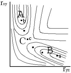 В системе трех координат эта зависимость передается поверхностью. Для представления зависимости энергии от расстояний rXY и rYZ на плоскости используется такой же метод, что и при построении топографических карт, а именно: проводятся равноотстоящие друг от друга плоскости, перпендикулярные оси энергии, а линии пересечения этих плоскостей с поверхностью наносятся на плоскость чертежа. На рис. 12 - 4 показан пример построения энергетической диаграммы по этому методу.