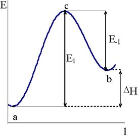 Разность между энергией системы в переходном состоянии и энергией в исходном состоянии Е1, как показано на рис. 12 - 5, представляет собой классическую энергию активации прямой реакции. Разность энергий в состоянии активного комплекса и конечном состоянии Е−1, равна энергии активации обратной реакции. Разность между энергиями активации прямой и обратной реакций соответствует тепловому эффекту реакции DН.