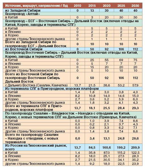 Табл. 10. Источники, маршруты и направления поставок газа из России на Тихоокеанские рынки в 2010 – 2030 гг., млн. м3 в год (средние значения)
