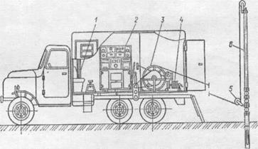 У фонтанной скважины устанавливают мостки для спуска и подъема приборов из скважины. При проведении исследований автомашину с лебедкой устанавливают на расстоянии 20-40 м от устья так, чтобы ось барабана лебедки была перпендикулярна к проволоке, идущей от устья скважины к барабану.