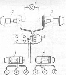 | 1 — скважина; 2 — насосный агрегат; з — пескосмесительный агрегат; 4 — вспомогательные насосные агрегаты; 5 — емкости для жидкости-песконосителя; 6 — емкости для жидкости разрыва и продавочной жидкости |