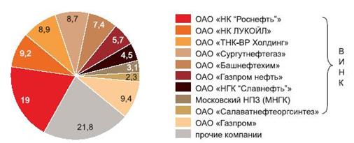 Среди нефтяных компаний первое место по установленным мощностям нефтепереработки на начало 2007г. занимала компания ОАО«НК “Роснефть”» – 61,4 млнт в год. Она же была лидером по переработке нефти в 2007г. Меньшими мощностями располагают ОАО«НК ЛУКОЙЛ» (40,6 млнт) и ОАО «Башнефтехим» (32,2млнт). В 2007г. на отечественные НПЗ поступило 229,5млнт, или около 48% добытой нефти; это почти на 8 млнт больше, чем в 2006г. Переработано из них 227,7млнт, или около 99,2% поставленного сырья. Практически всё оно переработано на 27 основных НПЗ. Безвозвратные потери нефти на российских перерабатывающих предприятиях составили менее 1%.