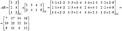 Для вычисления элемента, стоящего в i-й строке и j-м столбце произведения двух матриц, нужно элементы i-ой строки первой матрицы умножить на соответствующие элементы j-го столбца второй матрицы и полученные произведения сложить.