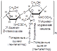 Рис. 6.16. Химическое строение повторяющейся единицы пептидогликана (слева) и схематическое изображение пептидогликана клеточной стенки